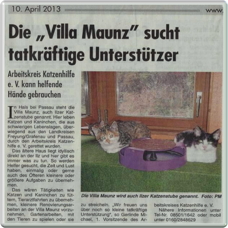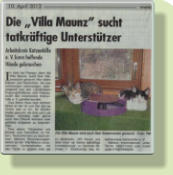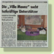 Sei es nun einmalig oder des Öfteren. In der “Katzenvilla Maunz” gibt es viele viele Arbeiten, die zu erledigen sind und wir freuen uns über jede noch so kleine tatkräftige Hilfe. Ob es nun Aufgaben sind wie: die Samtpfoten füttern Tierarztfahrtenkleinere Renovierungsarbeiten an der Villa Maunz Gartenarbeitendie Kaninchen/Hamster versorgenviele weitere Aufgabenodereinfach nur die lieben Vierbeiner zu streicheln (über welche sich jede der Samtpfoten hier freuen würde)Klicken Sie auf den nebenstehenden Zeitungsbericht, um diesen vergrößert darzustellen.